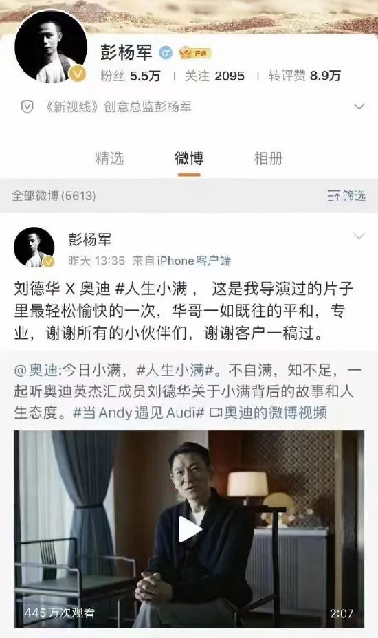 同日,该广告导演彭杨军在微博上转发奥迪侵权广告并配文称,“刘德华X奥迪#人生小满,这是我导演过的片子里最轻松愉快的一次,华哥一如既往的平和,专业,谢谢所有的小伙伴们,谢谢客户一稿过。”