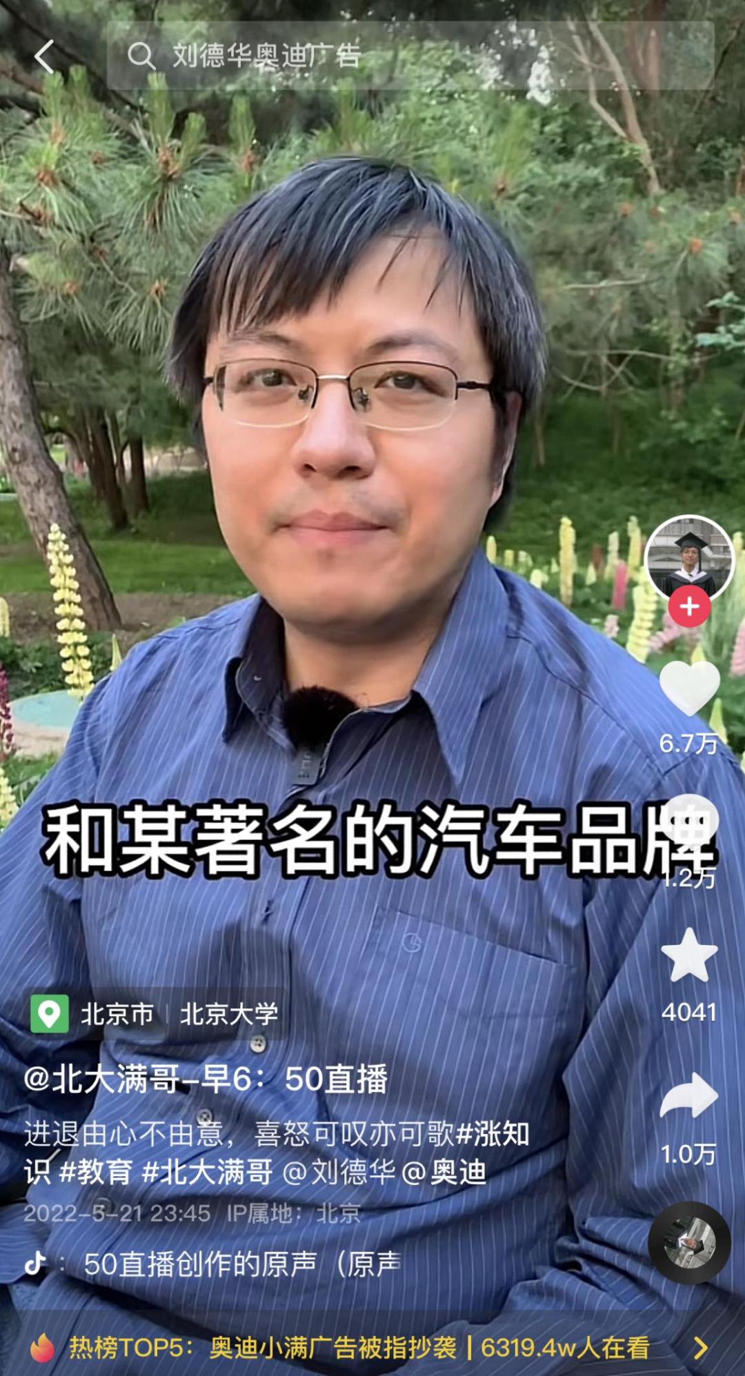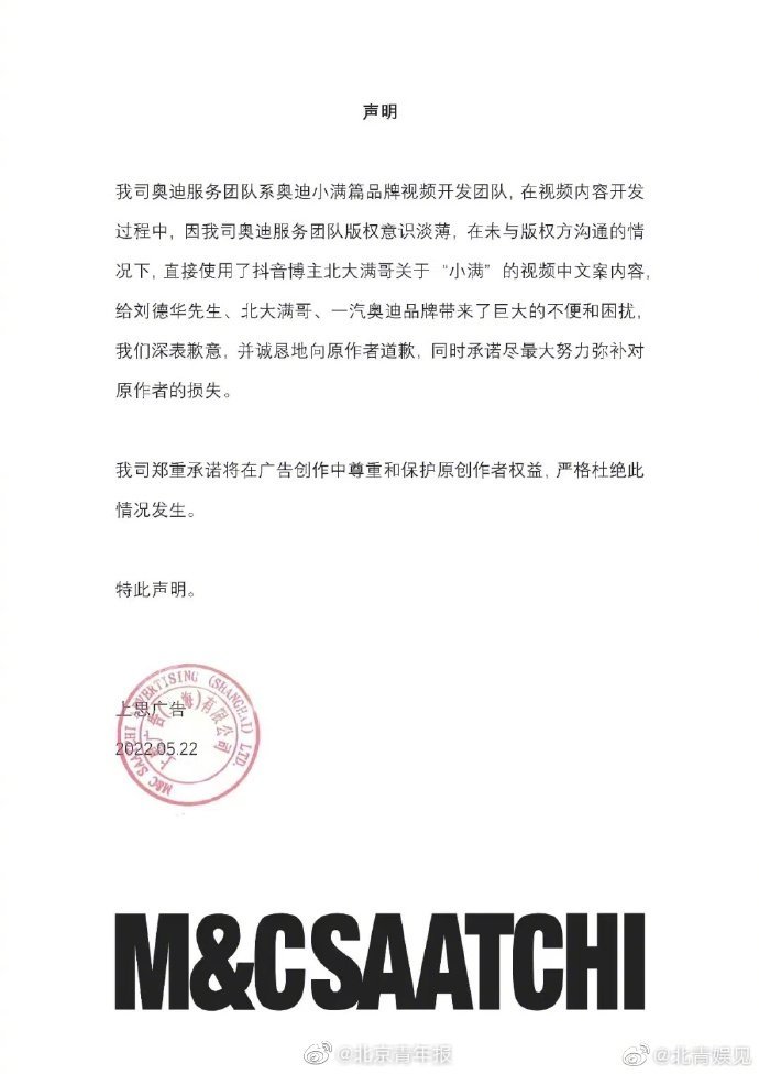 22日下午,“刘德华科普小满节气”提案方上思广告(M&C SAATCHI)在微信公众号发布声明称:我司奥迪服务团队系奥迪小满篇品牌视频开发团队,在视频内容开发过程中,因团队版权意识淡薄,在未与版权方沟通的情况下,直接使用了抖音博主北大满哥关于“小满”的视频中文案内容,给刘德华先生、北大满哥、一汽奥迪品牌带来了巨大的不便和困扰,深表歉意,并诚恳地向原作者道歉,同时承诺尽最大努力弥补对原作者的损失。