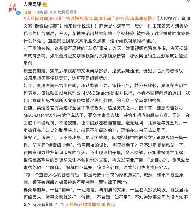 今日,人民网就此事发文评论称,对于奥迪来说,这是惨不忍睹的“车祸”事故。昨天,涉事视频点赞有多多,今天挨骂声就有多高。再豪华的车,一旦“翻车”,一定难堪。再刷屏的文案,一旦卷入抄袭风波,就会呈几何级丢人。涉事文案就这样一句话,“不自满,知不足”。不知道涉事公司有没有知不足?有没有知耻?
