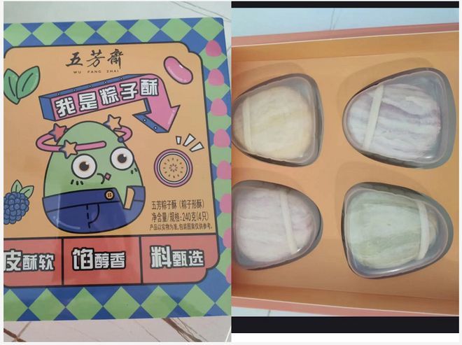 2021年12月,娜娜偶然在小红书看到有人分享一款粽子酥。“一盒四个粽子酥,有粉色、绿色、蓝色和白色的。一个粽子酥像是一个胖胖的鸭梨形状,太可爱了。我忍不住问了一下哪里买的,没想到是五芳斋发调查问卷的礼品。”娜娜回忆道