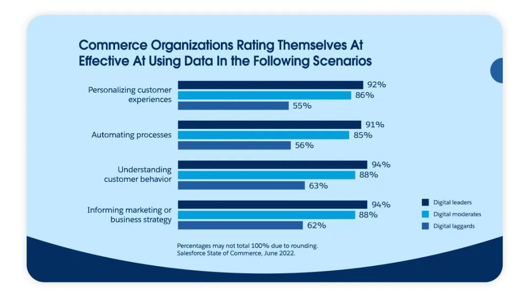 作为回应,36% 的商业组织计划在未来两年内对第一方数据战略进行投资,但计划与整体商业绩效相关。40% 的数字领导者——那些可以将公司的整体成功归功于数字商务的人——正在计划进行此类投资,相比之下,25% 的数字落后者——那些不能将公司的整体成功归功于数字商务并且没有高学历的人此类举措的成功。