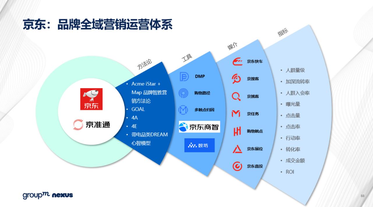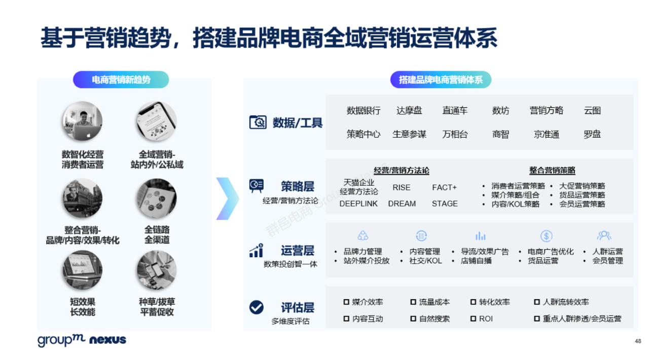 针对今年的新变化和新趋势,各平台也全面升级了自己的指标方法论和工具,为品牌进行全域、全链路、全渠道的整合营销及数智化经营助力。群邑电商基于营销趋势,搭建品牌全域营销运营体系,从数据/工具、策略、运营及评估四大维度,帮助品牌更有效整合串联品牌、内容、效果、销售等多方面,从而促进生意增长。