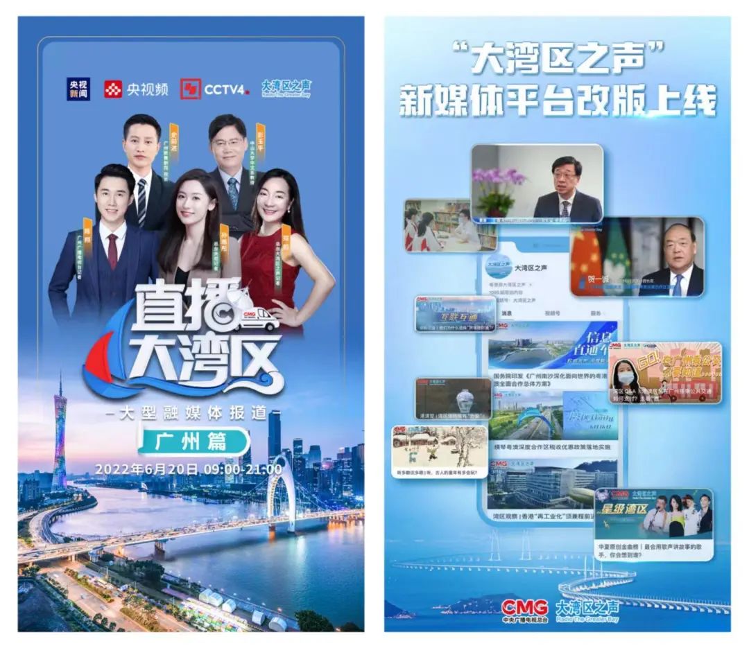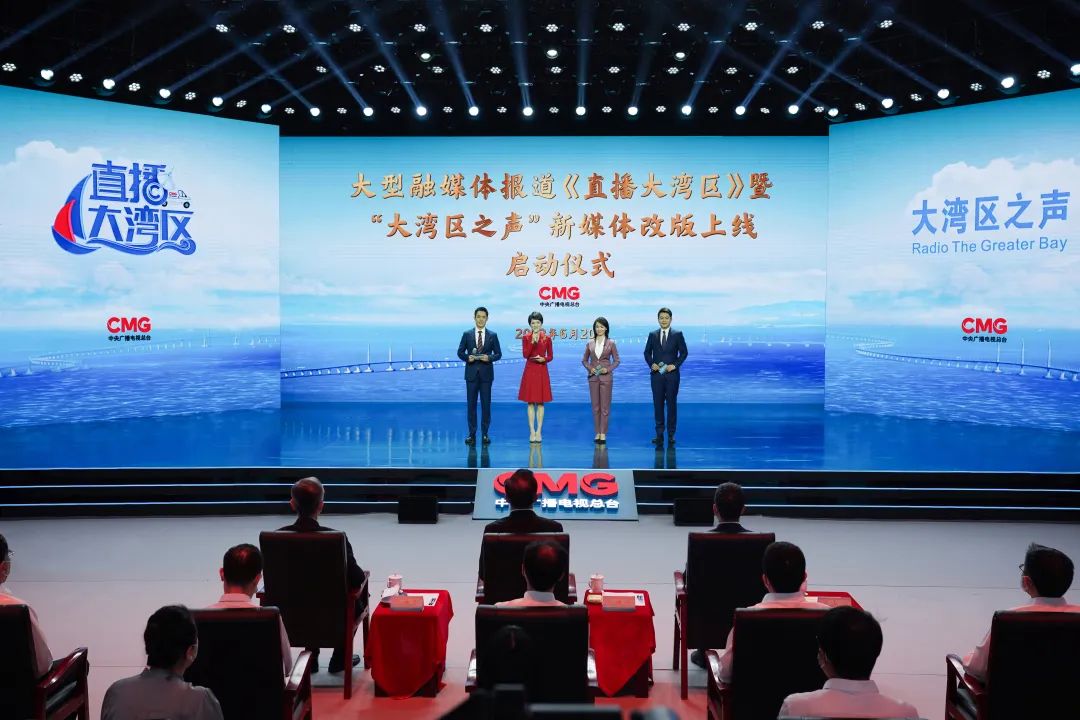 中央广播电视总台大型融媒体报道《直播大湾区》6月20日正式开播,总台“大湾区之声”新媒体同日改版上线。香港特别行政区第六任行政长官李家超、澳门特别行政区行政长官贺一诚以视频致辞的方式表示祝贺。中宣部副部长、中央广播电视总台台长兼总编辑慎海雄,广东省委常委、副省长王曦共同为两个项目启动。