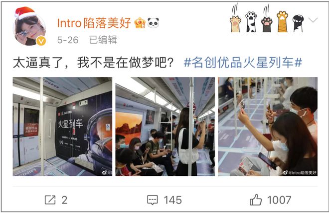 而名创优品也通过宇航员偶尔驻足在门店这一动作来将他们的注意力转移到了门店身上。同时这些宇航员还一路走到地铁站,登上各自“火星列车登陆点”,吸引用户好奇的同时也顺势将活动的具体信息推出,以这样的方式不仅不会引发用户的反感,反而会更受他们的欢迎。