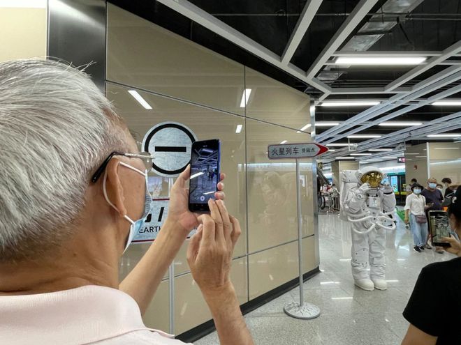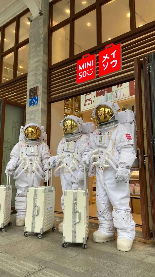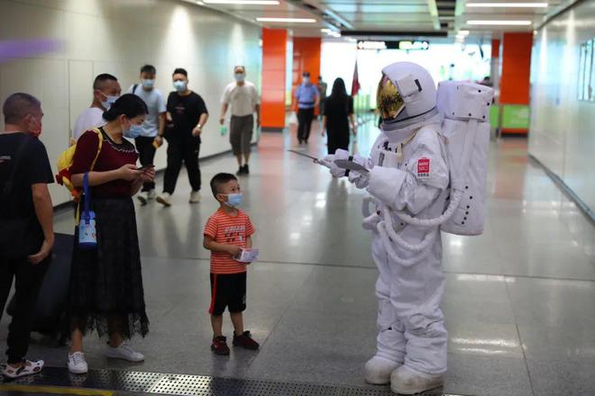 除此之外,为了让噱头更足、活动氛围更浓,品牌还在活动正式上线之前派出品牌的员工身穿宇航服、背着航天包和手拉行李箱,穿过广州大街小巷,在地铁等待了整整三天。这样充满神秘感的形象出现在用户的生活中,也无疑快速引发他们的好奇心。