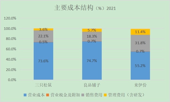 同样是线上+线下,良品铺子的营业成本也很高,但近几年的营收仍能支撑销售渠道高昂的成本,净利率相对较为平稳;而来伊份近9成的销售则来自线下渠道的贡献,成本费用相对来说低一些,不过做下来的净利率却低得多。