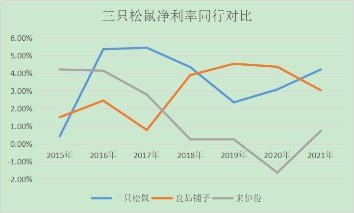 在同行中,近几年三只松鼠在营收和净利率方面的表现并不佳。