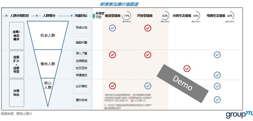 报告梳理了各平台的媒介路径和搜索商业基础建设,并总结出新搜索的三大媒介路径:开放型搜索的强互联路径,平台生态型搜索的强内容路径和强落点路径。