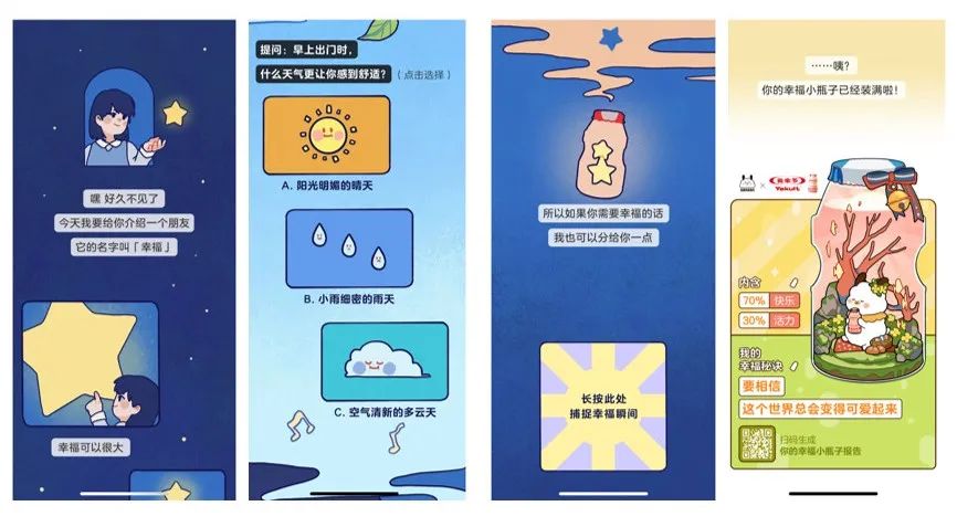 不仅如此,品牌更将每个人的幸福各不相同的特点和年轻人追求个性彰显的心理深度融合,紧跟动画短片,推出极具个性表达的可互动条漫 —《幸福小瓶子报告》。