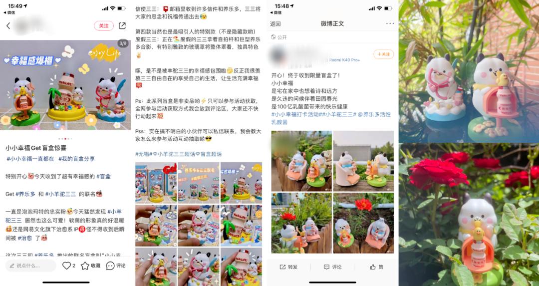 微景观合影、创意开盒视频、美好滤镜写真等,用户的创意发酵,为「三三的小幸福」盲盒增添了更多幸福治愈力,也让「养乐多」成为更多用户心中「小幸福」的关联词。