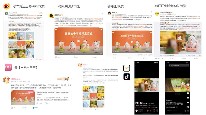 合作网易文创旗下@羊驼三三幼稚园、@网易哒哒等多账号联合发布活动,盲盒达人 @潮玩小仙儿、@冰雪艺仔 、@我是大露露呀 ,短视频博主 @拉哥真的很严格 开盒种草,横跨微博、视频号、小红书、抖音、B站五大平台,破圈激活粉丝营销,全网引爆#小小幸福打卡活动#话题事件。