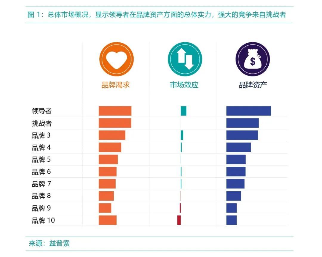 通过益普索品牌价值创造模型可以看出,领导者拥有更高的市场份额,但其和挑战者的品牌渴求度相差无几。品牌渴求量化了人们与品牌的关系强度,简言之它衡量了人们有多想要这个品牌。(如图1所示)