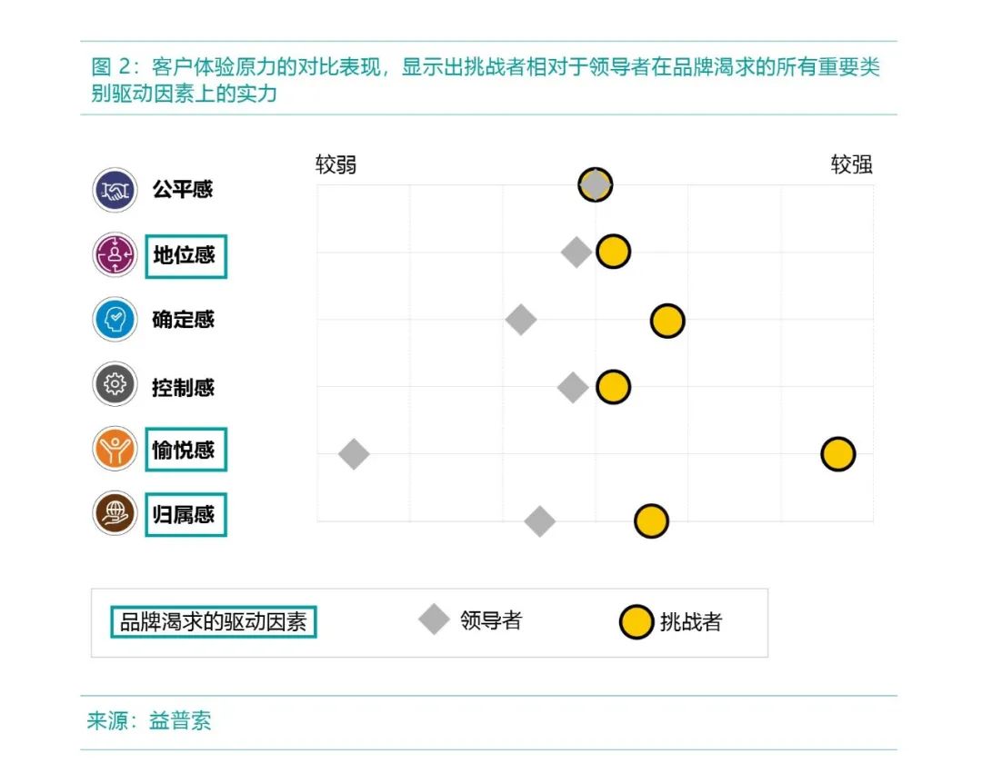 挑战者目前是否存在更大的发展机会呢?我们可以通过益普索客户体验原力进行进一步探索。客户体验原力植根于行为科学,帮助企业塑造品牌和体验体系,满足客户的功能型需求和关系型需求。