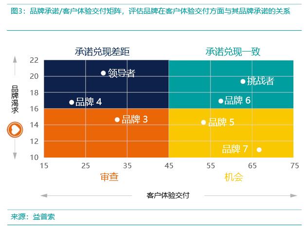 结合品牌渴求与客户体验原力进行交叉分析,我们发现领导者处于品牌承诺/客户体验交付矩阵的左上象限,这表明品牌承诺与客户体验之间存在差距;而排名第二的挑战者则处于右上象限,这表明品牌承诺与客户体验是一致的。(如图3所示)