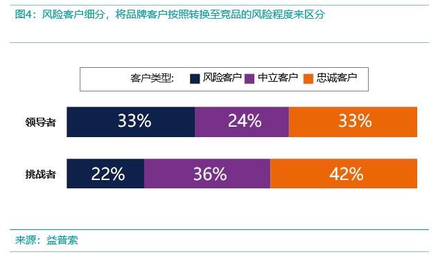 与挑战者相比,领导者面临着更多客户脱离该品牌的风险,同时这些品牌客户关系较弱的客户只会在该品牌花费很少的钱;与此同时,挑战者有更多忠诚客户,这些拥有强大客户关系的忠诚客户在该品牌的钱包份额显著更高。钱包份额是一个基于调查的指标,用于衡量人们在某一类别中分配给每个品牌的支出。