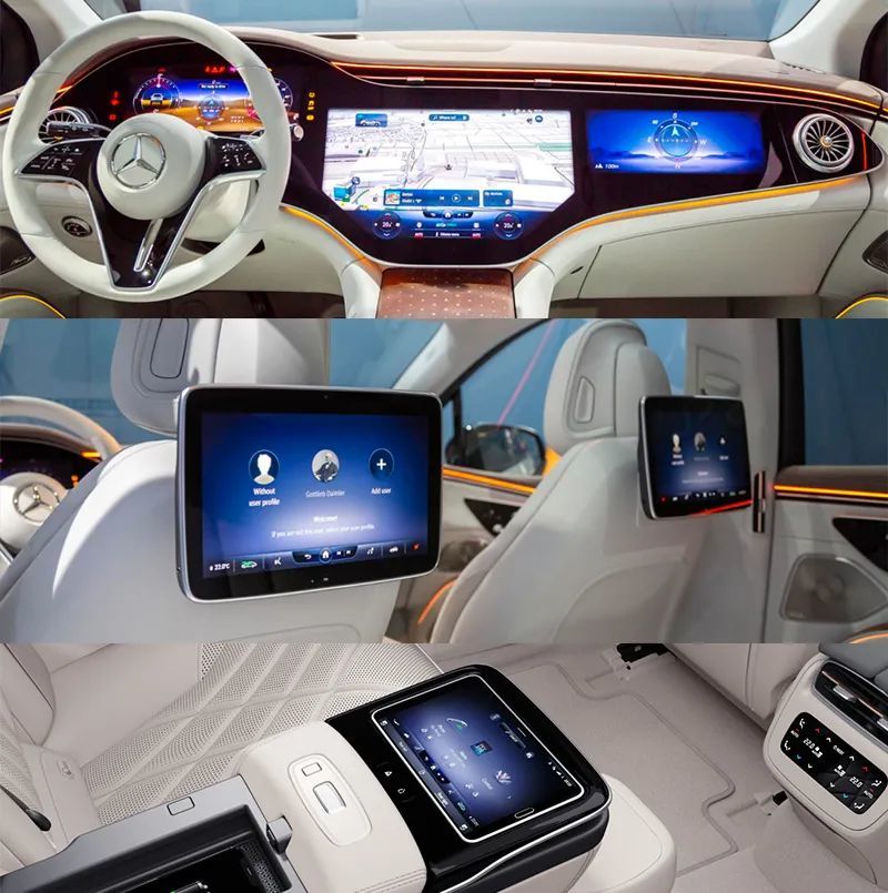 比如,飞凡R7车内搭载的43英寸宽幅真彩三联屏,官方宣称创下了中国品牌最大尺寸的车载三联屏的纪录;岚图FREE也搭载了三块12.3英寸的三联屏;奔驰EQS三块屏完全取代了实体按键,整体长达1.41米的宽度,前排座椅后面均配备两块大屏,尺寸为12.3英寸,就连后排音响系统和空调调节也带有屏幕控制。