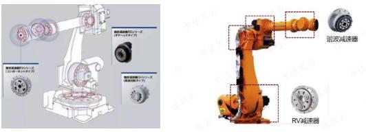 其中,在机械部底座、肩部起支撑作用的多为RV减速器,可理解为“大关节”;到执行操作的小臂、腕部等,则主要为“小关节”谐波减速器。一般来说,一台六轴机器人共使用6个减速器,其中底座、肩部使用RV减速器(2个),其余部分使用谐波减速器4个。