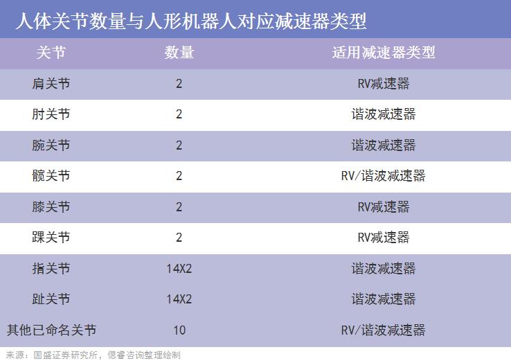 人的身体有78个关节,其中使用谐波减速器和肘关节、腕关节、指关节和趾关节就共有60个;剩余的18个关节则用RV减速器。人形机器人使用减速器数量之大,想不被关注都不行。
