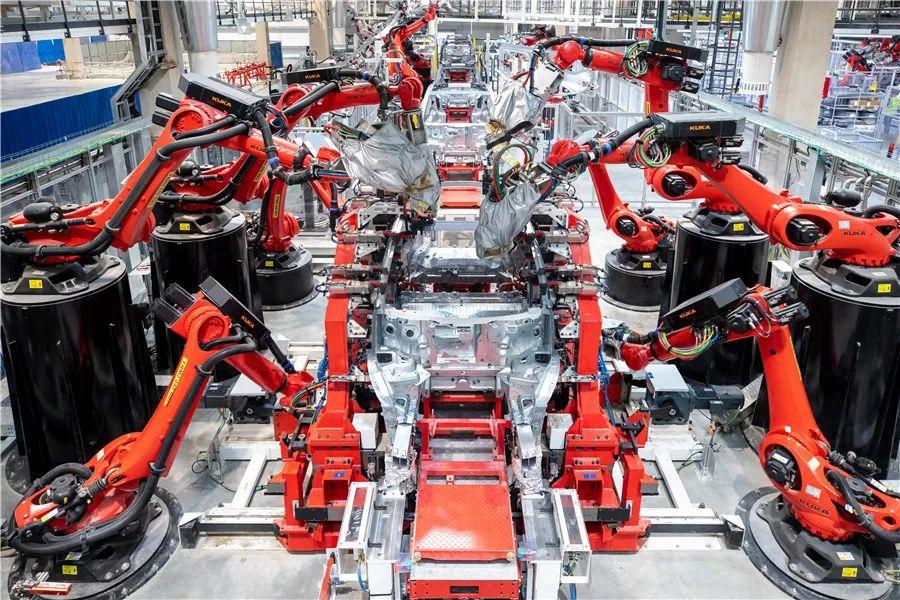 (特斯拉 上海工厂焊装车间生产线上密集的工业机器人)