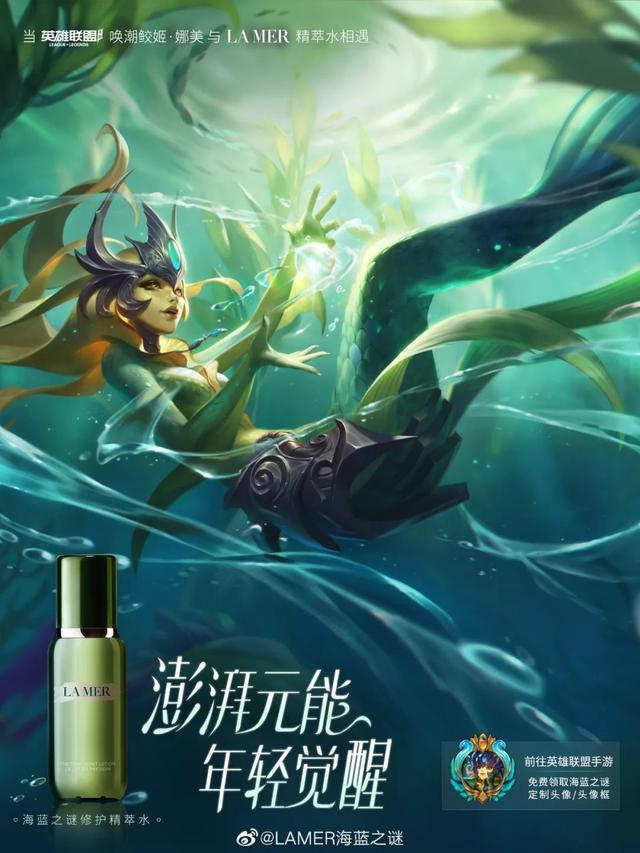 近日,全球高奢护肤品牌海蓝之谜一改以往调性,出乎意料地选择与风靡全球的游戏IP英雄联盟手游版共创IP跨界营销,通过海蓝之谜全新升级的明星单品“海蓝之谜修护精萃水”与“以唤潮者之杖号令潮汐”的英雄联盟经典英雄“唤潮鲛姬·娜美”进行联动,深度挖掘共通的水元素能量,进一步传递了海蓝之谜与海洋共生的品牌价值。