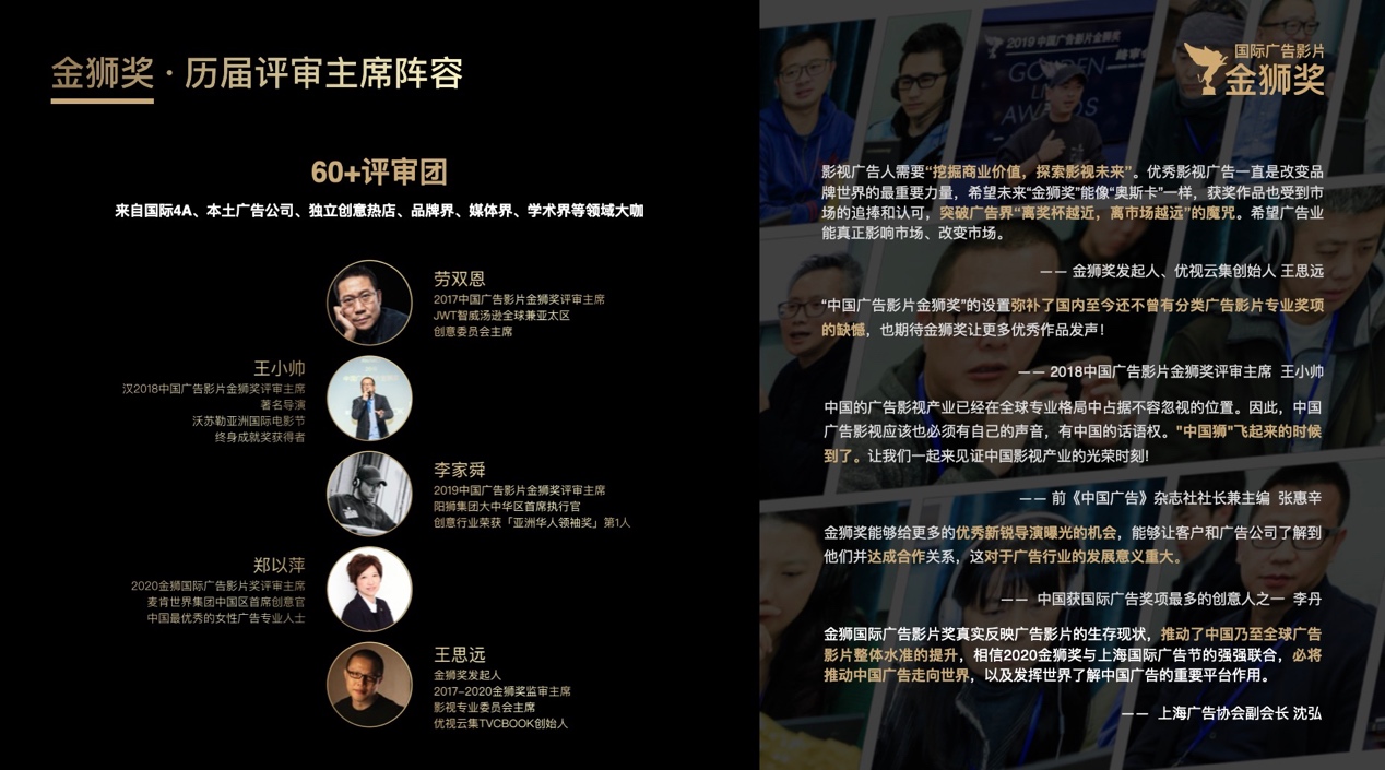 诞生于 "挖掘商业价值,探索影视未来" 的初衷,金狮奖Golden Lion Awards 持续致力于挖掘出年度广告影片背后这些国内外优秀的创作者。商业价值的诞生始于品牌和优秀创作者的努力共建,影视未来成于幕后每个为之奋斗的创作者。
