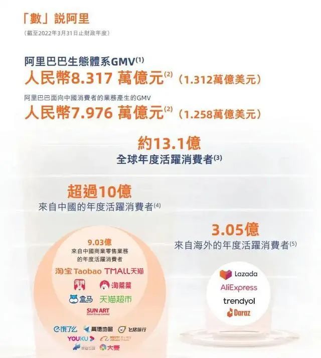 与此同时,7月26日,阿里巴巴集团公布了2022财年年报,年报显示,在截至2022年3月31日的财政年度中,阿里巴巴全球年度活跃消费者13.1亿,其中超10亿来自中国市场,3.05亿来自海外。GMV为83170亿元,其中中国市场占79760亿元,国际市场占540亿美元。