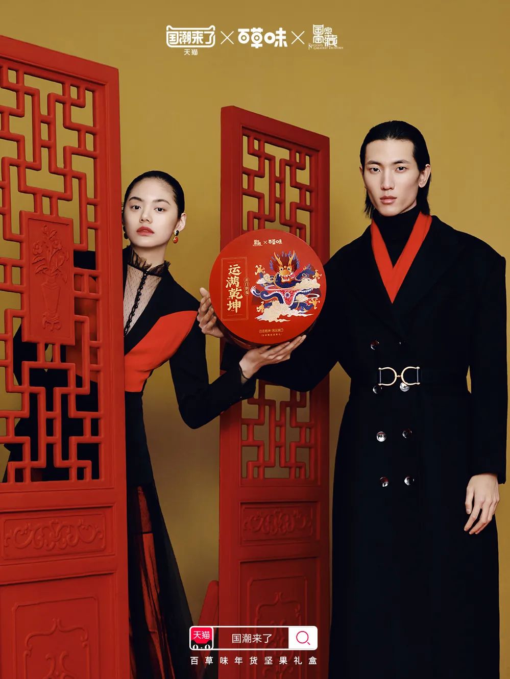 作为休闲零食行业的龙头之一,“中国味”十足的休闲零食品牌百草味巧妙地抓住了“国潮”的风口。继与颐和园合作后,百草味于2020年货节期间再度联手国潮IP,联合国家宝藏推出“开门纳福”系列IP礼盒,分别取材三款福泽深厚的“国宝”为创意内容,推出“瑞象万千”、“祥瑞潮盒”以及“运满乾坤”三款产品,向国人传递新潮年礼文化。