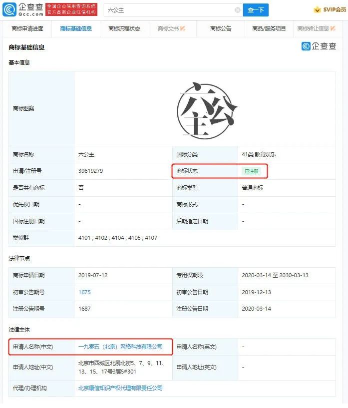 与此同时,天眼查App显示,一九零五(北京)网络科技有限公司已申请注册近40个“六公主”商标,这些商标申请于2019年7月,国际分类包括教育娱乐、社会服务、办公用品等,其中30余个商标已注册成功。
