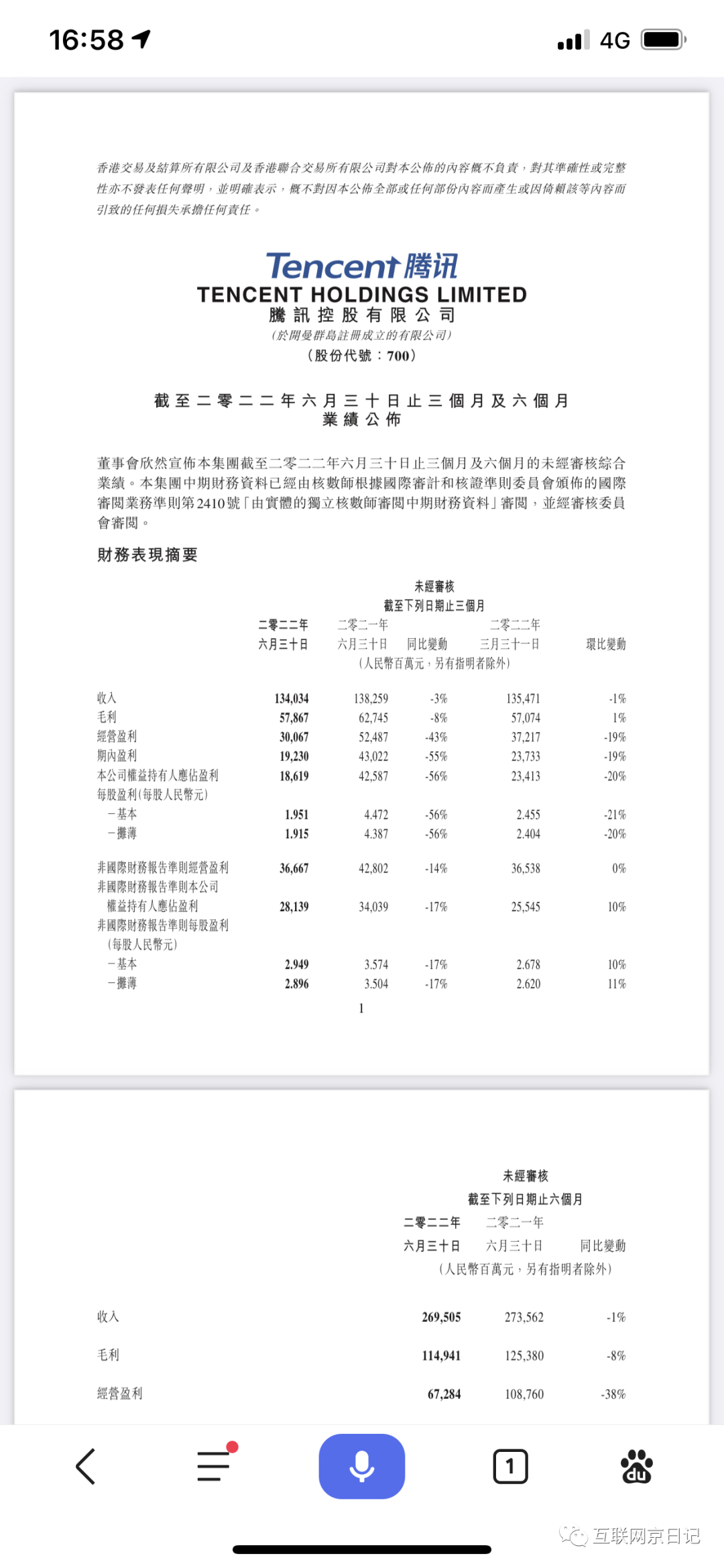 腾讯公司刚刚在香港联交所发布了堪称其史上最差的一次财报。除环比一季度净减员约百分之五外,运营利润相比去年亦大幅下滑43%,月均员工薪酬福利更是罕见下降约900元人民币。