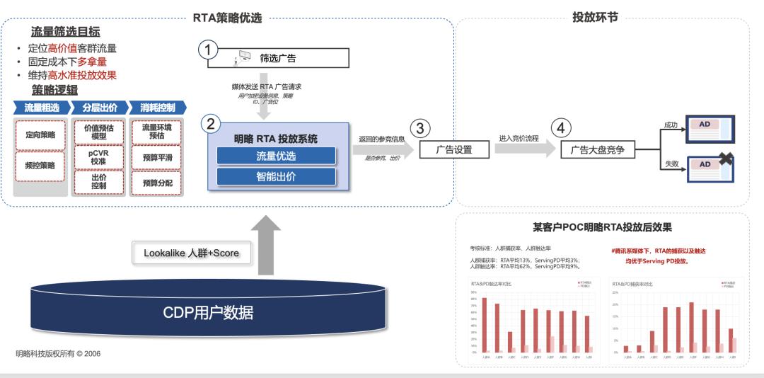 场景2:电商站内投放提效每年的几次电商大战,都是零售品牌重兵投入的战役。然而,电商平台的规则限制、平台间的客群差异化,都在限制着站内投放的效率。明略科技全域用户增长解决方案,根据品牌用户结构和规模,制定相应策略,通过实时统计级数据分析、算法模型及专家规则的白盒化离线投放进行策略调整,结合数据情况、专家规则,实现打标打分、效果预警、指标调整、建议输出等功能,并通过自动调整,形成一个闭环线上投放的优化方案,提高电商站内投放ROI。