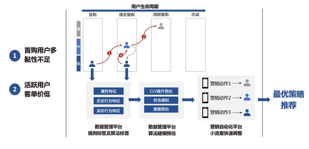 如今全渠道的运营场景下,用户生命周期的状态跃迁往往呈现非线性和无序性。明略科技全域用户增长解决方案,按照CLV切分用户结构,进行特征细化识别与算法评估,通过营销自动化平台小范围实现流量快速调整,最终输出最优的营销动作策略。通过识别可被优化的利益提供和转化路径,最终实现用户状态跃迁/维持。