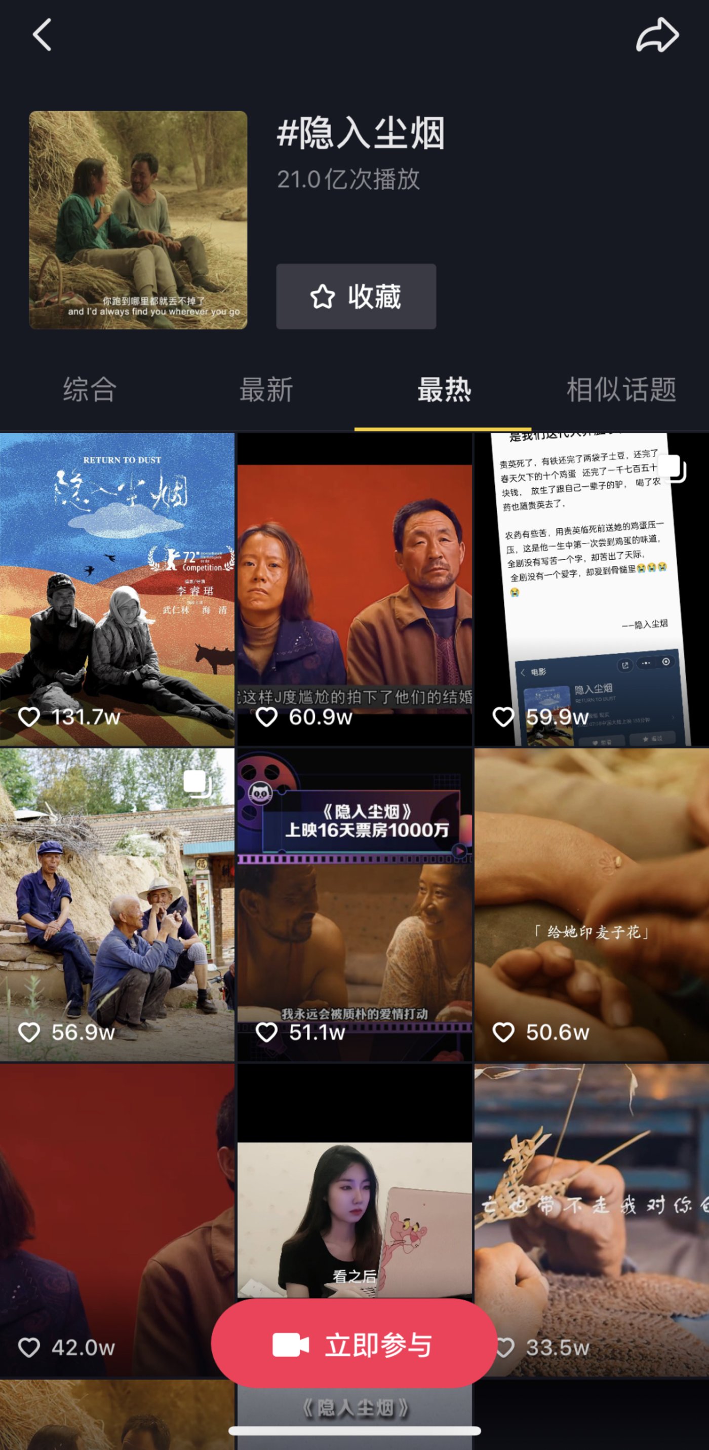 根据猫眼数据统计,《隐入尘烟》在抖音的话题播放量已经达到21亿,并且多次登上抖音热搜榜。2022年8月30日,《隐入尘烟》的抖音官方账号点赞数也已经超过814.9亿。与微博官方账号的几千粉丝数相比,抖音官方账号近20万的粉丝实在是声势浩大。