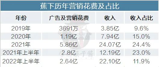 这些均意味着高昂的营销投入。据其招股书显示,2019、2020、2021及2022上半年,蕉下的广告及营销开支分别为3691万、1.19亿、5.86亿和2.64亿,占比当期收入的9.6%、15%、24.4%和11.9%。