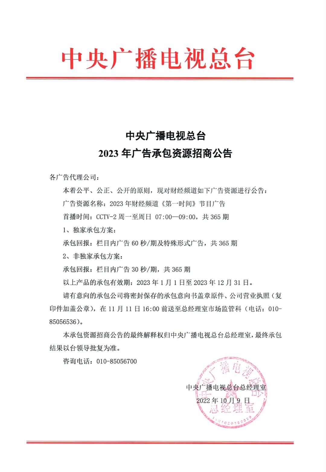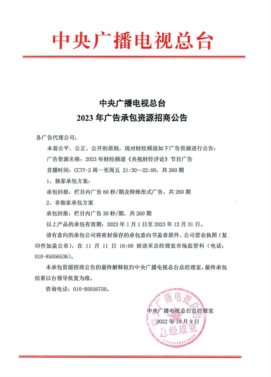 中央广播电视总台2023年CCTV-2《央视财经评论》《第一时间》广告资源招商公告