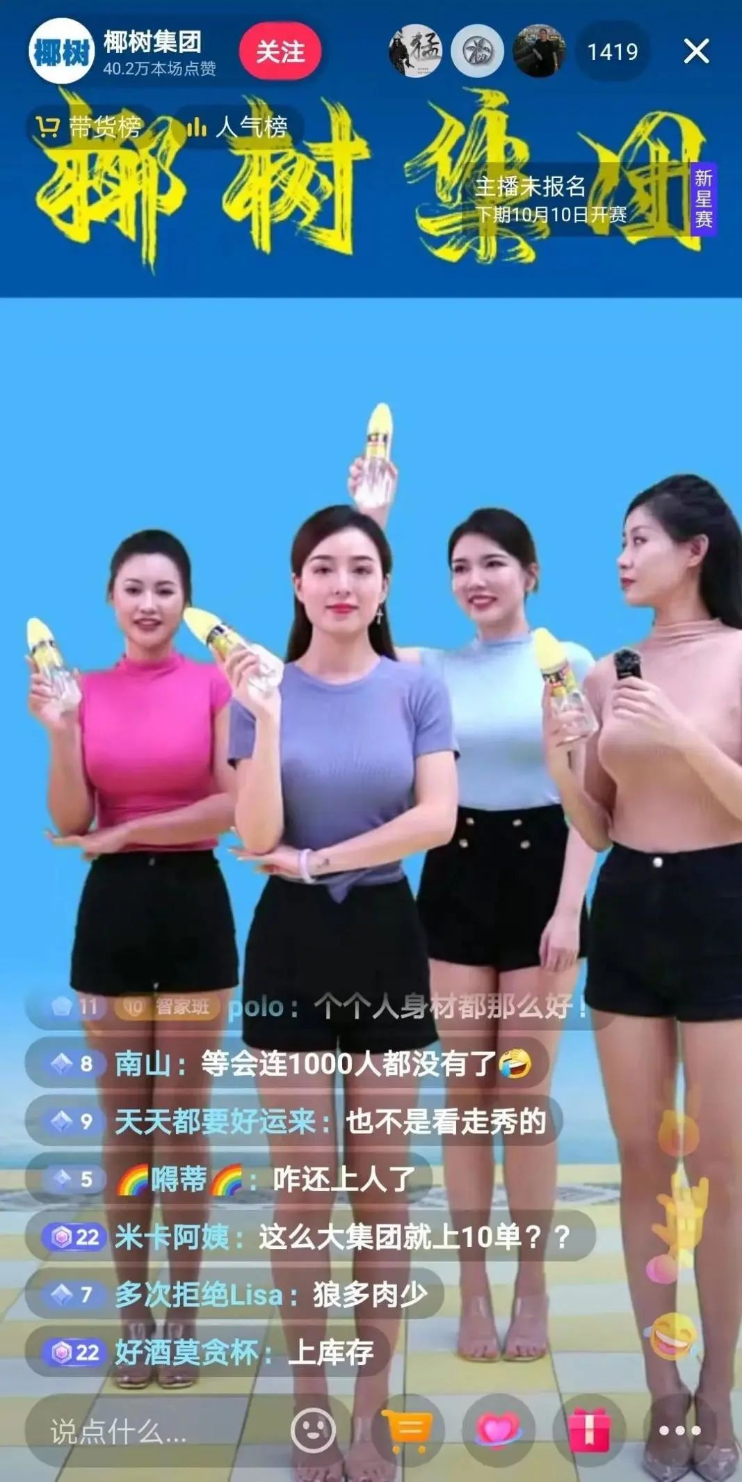 10月1日,椰树在没有任何预告的情况下在抖音开通了自己的直播,截至10月8日,共进行了10场。期间,@椰树集团 发布了多个预热视频,为此次直播造势,视频内容都是手持椰树产品的高颜值美女,直播间观看人数屡破10万。但是,椰树的直播之路却并不顺利。10月8日,椰树官方直播仅仅开始五分钟就被平台中断,重新开播仅6分钟后再次被掐断,一时间关于椰树直播打“擦边球”违规的声讨喧嚣尘上。有网友认为,椰树的直播和营销方式并不正向,不应该被推广和认可,也有一部分网友站在椰树一边,认为这样的方式接地气,主播们的着装也是正常的,并不涉嫌违规。据红星新闻报道,面对广大网友的争议,椰树集团方面回应称,暂时不了解相关情况,开设直播是因为产品需要,不清楚网友评价。巨大的争议带来了巨大的声量,#椰树集团直播带货风格引争议#等话题相继登上微博热搜,阅读量已突破3亿,椰树集团的抖音账号吸引了37.9万粉丝的关注。