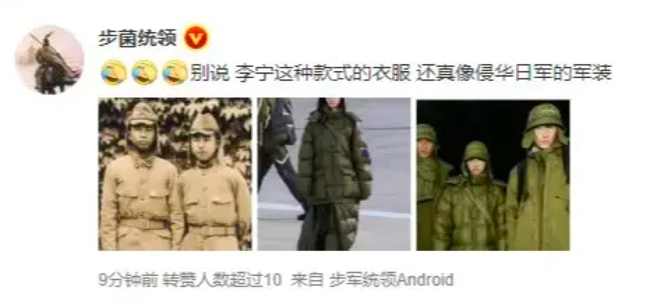 有网友发现,在最近的新品发布会走秀环节,李宁发布的新品服装疑似侵华日军军服:衣服整体是绿色且帽子有帘子垂下来。
