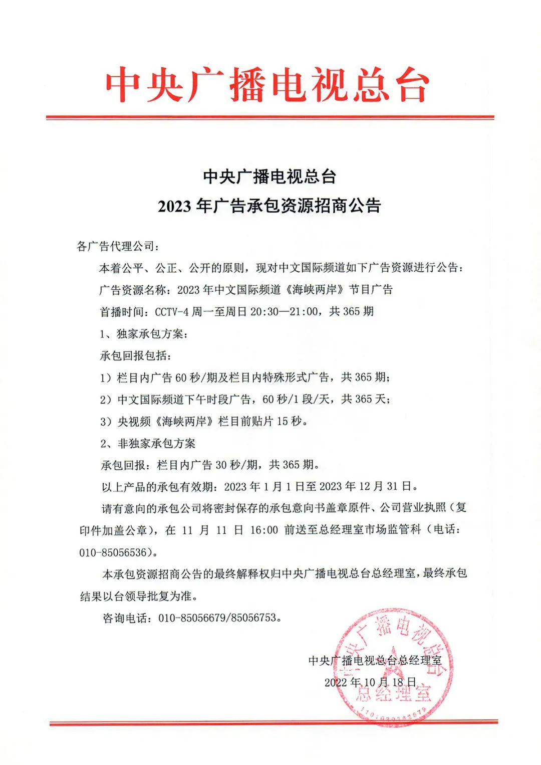 中央广播电视总台CCTV-4《海峡两岸》2023年广告资源招商公告
