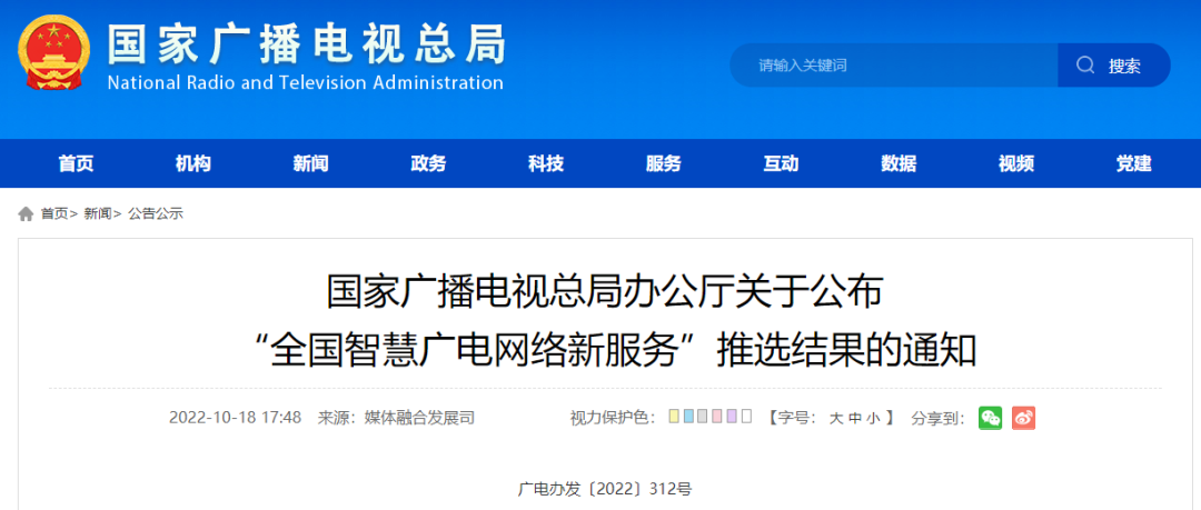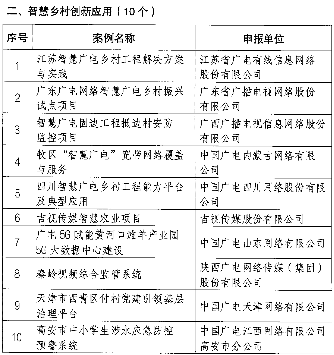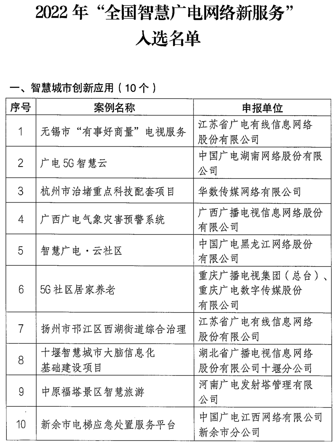 10月18日,国家广播电视总局官网发布《关于公布“全国智慧广电网络新服务”推选结果的通知》(以下简称《通知》)。《通知》提到,2022年5月,国家广播电视总局启动了“全国智慧广电网络新服务”推选工作。经过推选和公示,确定最终入选的智慧城市创新应用、智慧乡村创新应用、智慧家庭创新应用、文化数字化创新应用各10个,共计40个。其中,智慧城市创新应用包括江苏省广电有线信息网络股份有限公司的无锡市“有事好商量”电视服务、中国广电湖南网络股份有限公司的广电5G智慧云、华数传媒网络有限公司的杭州市治堵重点科技配套项目、广西广播电视信息网络股份有限公司的广西广电气象灾害预警系统等。智慧乡村创新应用包括江苏省广电有线信息网络股份有限公司的江苏智慧广电乡村工程解决方案与实践、广东省广播电视网络股份有限公司的广东广电网络智慧广电乡村振兴试点项目、广西广播电视信息网络股份有限公司的智慧广电固边工程抵边村安防监控项目、中国广电内蒙古网络有限公司的牧区“智慧广电”宽带网络覆盖与服务、中国广电四川网络股份有限公司的四川智慧广电乡村工程能力平台及典型应用等。