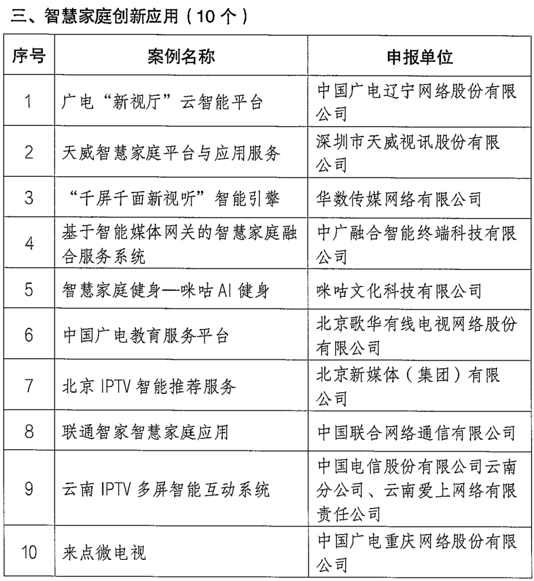 智慧家庭创新应用包括中国广电辽宁网络股份有限公司的广电“新视厅”云智能平台、深圳市天威视讯股份有限公司的天威智慧家庭平台与应用服务、华数传媒网络有限公司的“千屏千面新视听”智能引擎、中广融合智能终端科技有限公司的基于智能媒体网关的智慧家庭融合服务系统、咪咕文化科技有限公司的智慧家庭健身——咪咕Al健身等。