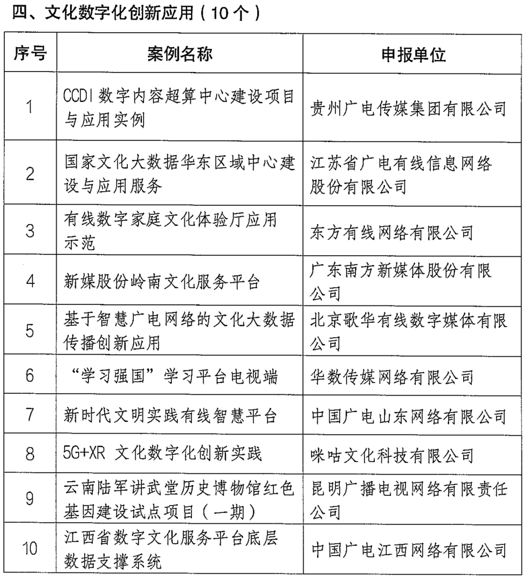 文化数字化创新应用包括贵州广电传媒集团有限公司的CCDI数字内容超算中心建设项目与应用实例、江苏省广电有线信息网络股份有限公司的国家文化大数据华东区域中心建设与应用服务、东方有线网络有限公司的有线数字家庭文化体验厅应用示范、广东南方新媒体股份有限公司的新媒股份岭南文化服务平台、北京歌华有线数字媒体有限公司的基于智慧广电网络的文化大数据传播创新应用、华数传媒网络有限公司的“学习强国”学习平台电视端等。