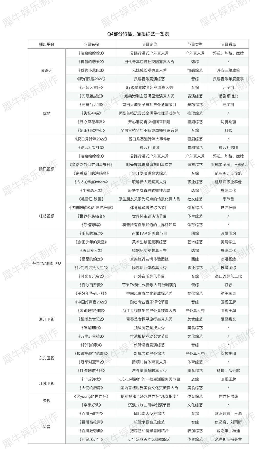 台端方面,月底《好声音》决赛、《极限挑战宝藏行3》等卫视王牌蓄势待发,此前遭遇状况的节目即将扎堆在Q4释出。网端方面,爱奇艺的《我们民谣2022》、优酷的《朝阳打歌中心》、腾讯视频的《来看我们的演唱会》、芒果TV的《会画少年的天空》都彰显出长视频开发新综项目的实验性,致力于给市场带去新内容的“鲶鱼”。