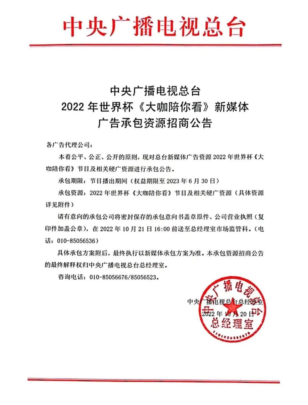 中央广播电视总台2022年世界杯《大咖陪你看》新媒体广告资源招商公告