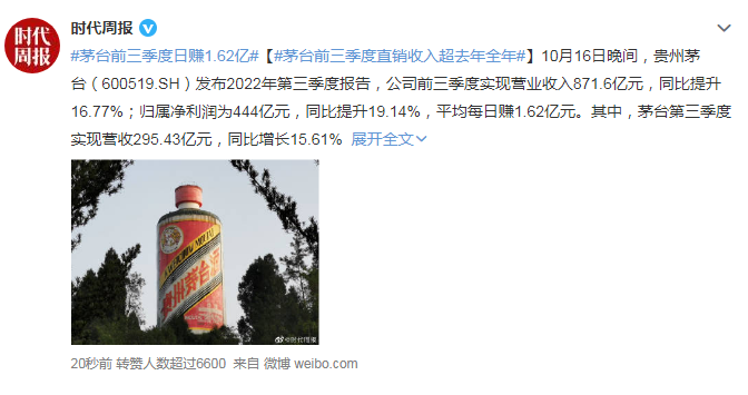 10月16日,“酒王”茅台发布第三季度业绩报告:2022年前三季度实现营业收入871.6亿元,同比增长16.77%;净利润高达444亿元,同比增长19%。