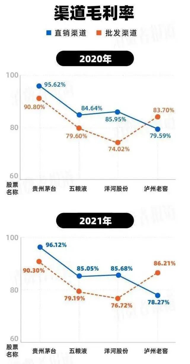 以2020年、2021年茅台的渠道毛利率来看,2020年直销为95.62%、分销为90.8%;2021年这两组数据分别为96.12%、90.30%。