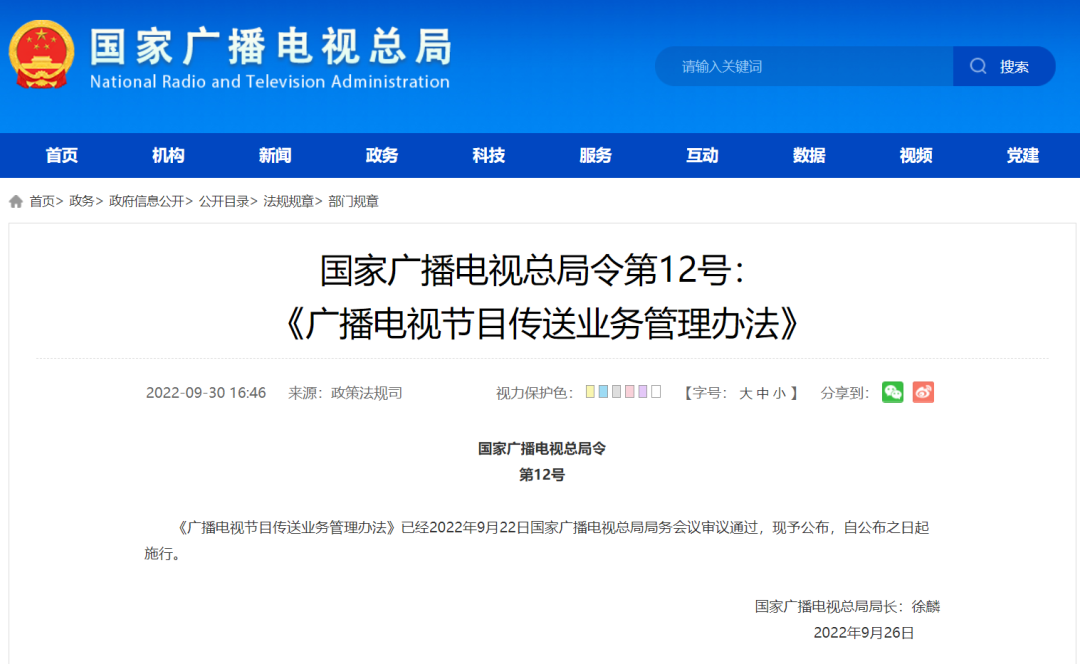 《广播电视节目传送业务管理办法》已经2022年9月22日国家广播电视总局局务会议审议通过,现予公布,自公布之日起施行。