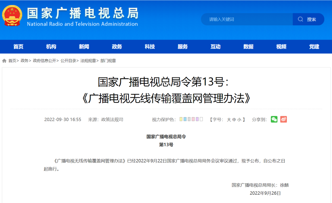 《广播电视无线传输覆盖网管理办法》已经2022年9月22日国家广播电视总局局务会议审议通过,现予公布,自公布之日起施行。