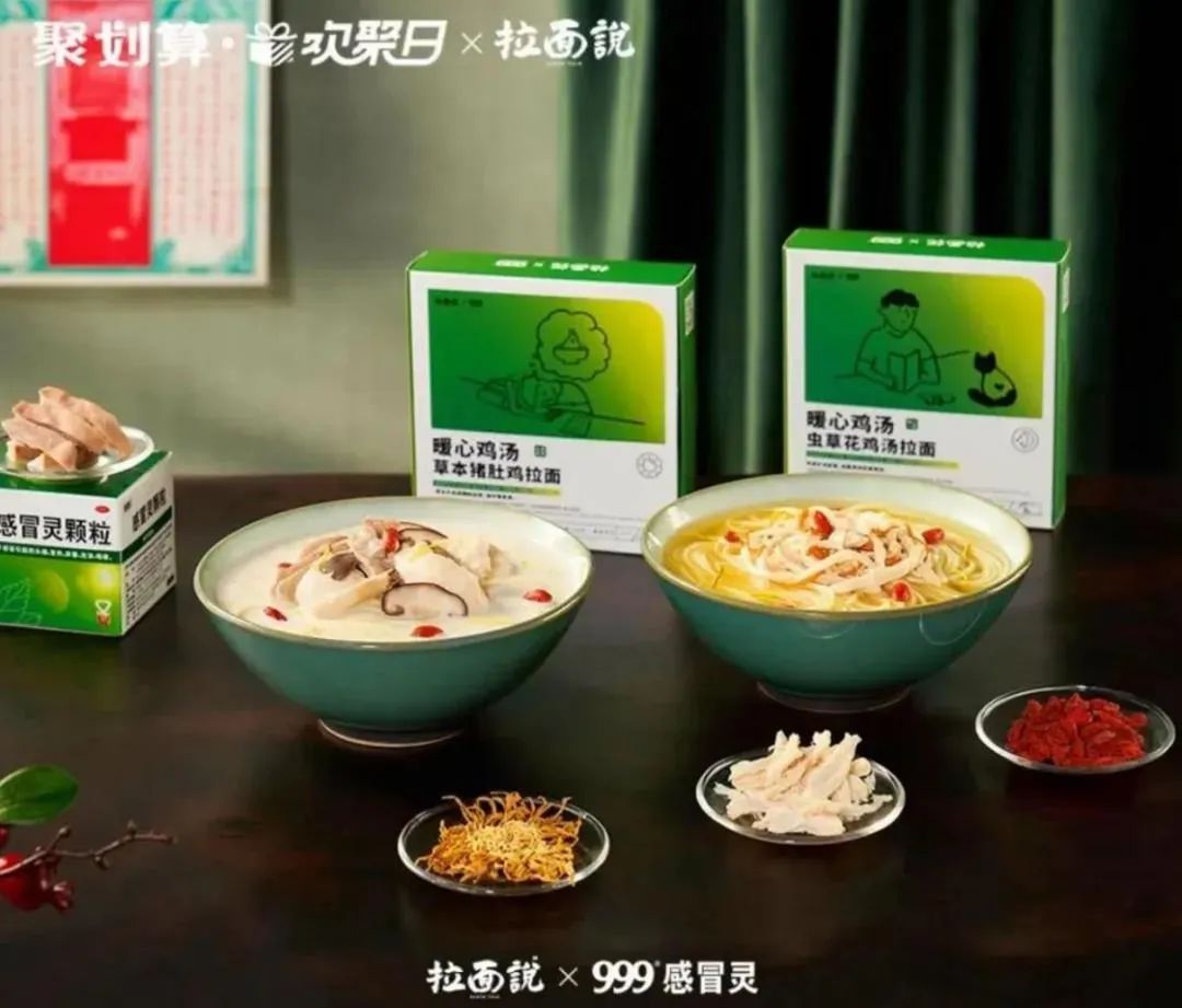 ▍999×拉面说灵魂跨界,“感冒灵拉面”超暖心!受疫情的影响,999与拉面说一起合作,联名推出了“暖心鸡汤面礼盒”。这款暖心鸡汤面共有虫草花鸡汤面、草本猪肚鸡面两个口味,同时礼盒还包含吃货门诊·簿(手账本)、通运·贴(手机防滑贴)和立刻有冲·剂(随手冲茶包)等一系列周边。而为了推广联名产品,此次跨界合作不仅上线了“来一剂治冷良方”主题的三支广告片还与KOL合作品牌定制推广Vlog。999感冒灵与拉面说的跨界联名出人意料,吸引了消费者求新求奇的消费心理,强烈的画面冲突也吸引人们的围观。而设计上采用了999感冒灵经典包装设计,建立了品牌间的强关联。而广告片和KOL定制Vlog的推出,更是增强了情感内容的输出,扩大传播声量和影响力。