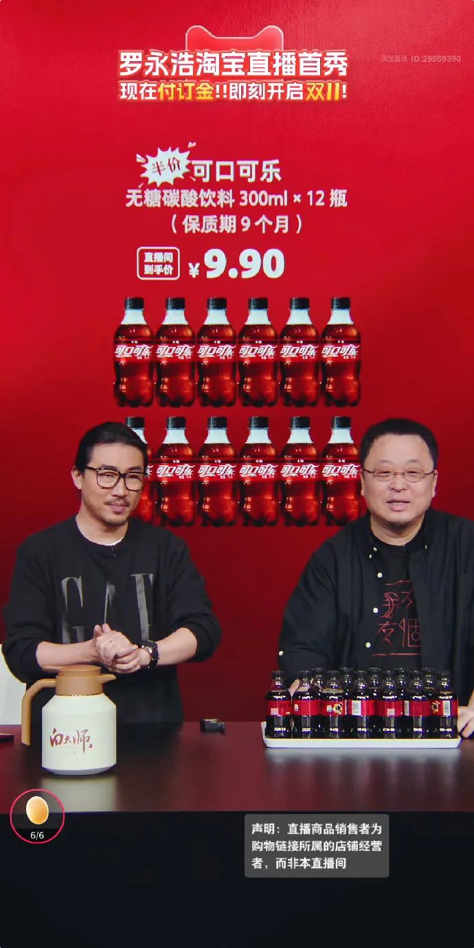 今天(10月24日)晚间6点左右,罗永浩出现在了淘宝直播间,以9.9元一箱的可口可乐、1元的三只松鼠小饼干、1元3瓶的精酿啤酒开启了“双十一”的直播。