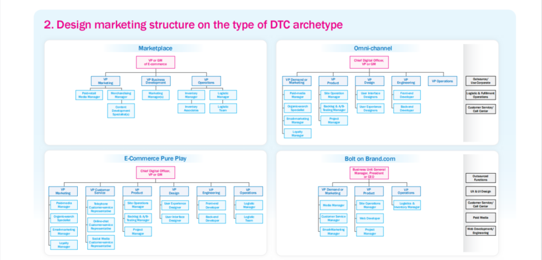 DTC团队有独特的核心重点,即需求的产生、获取和保留。他们更倾向于采用扁平化的层级结构,以便于更快地作出高度知情的决策,而资源配置往往意味着保持对核心能力的控制,同时将某些部分外包出去。