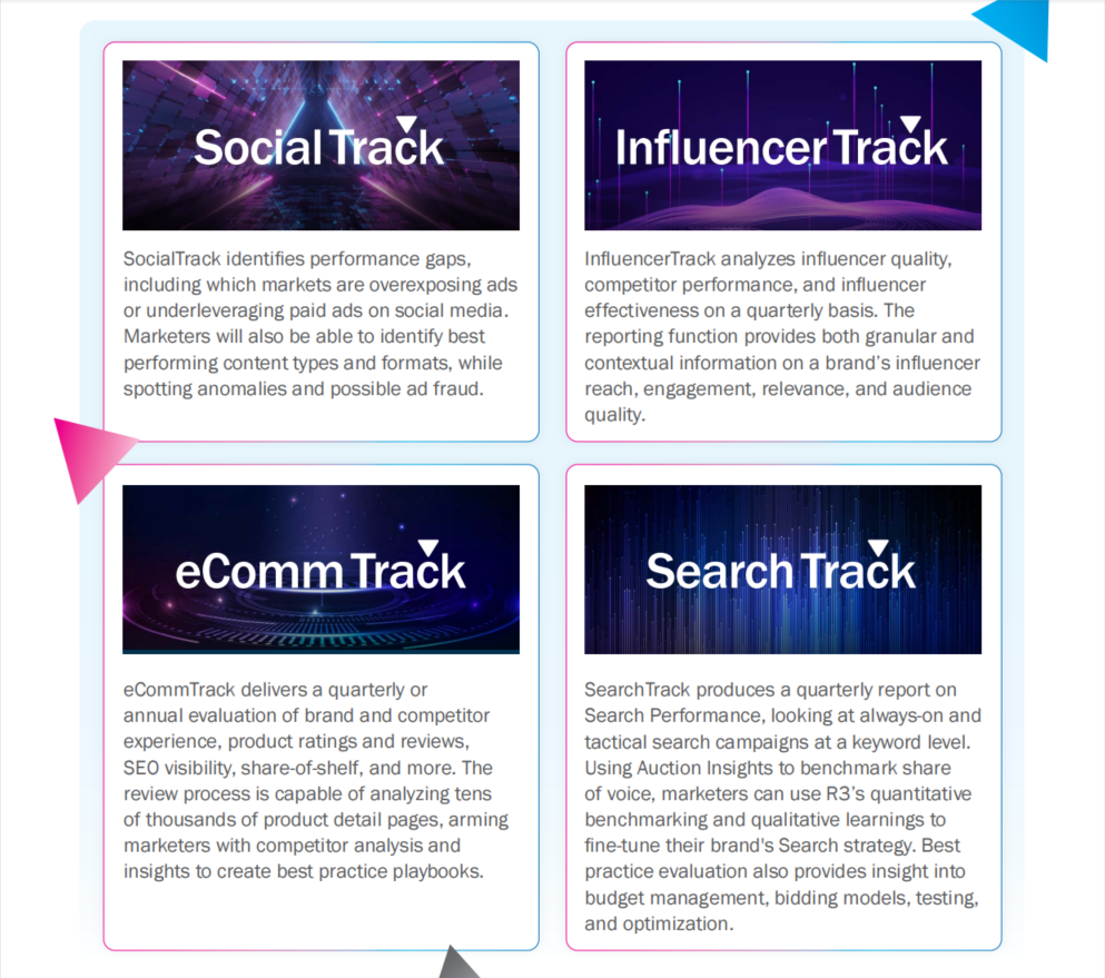 SocialTrack、InfluencerTrack、eCommTrack和SearchTrack的开发是为了提供与业务相关的指标,帮助市场主在营销的四个关键领域提高业绩。每项数字追踪服务都使用定制的审计,以季度或年度为基础,提供带可定制、战略级以及战术建议的深入报告。